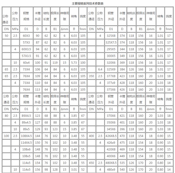 本系列卡箍式柔性管接头是按国家标准管径配套和根据铸石复合管,管径配套设计,每项通径分几种规格,如工程中还需其它规格管径在订货时注明我厂可进行设计配套卡箍。